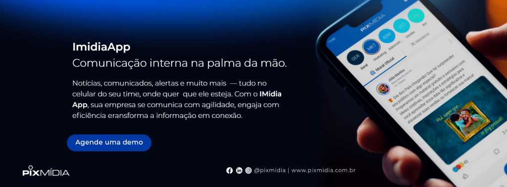 O ImidiaApp, da Pix Mídia, é um exemplo de plataforma que disponibiliza esse tipo de suporte, ajudando as equipes de RH e Comunicação Interna a explorarem todo o potencial da ferramenta, desde o planejamento dos conteúdos até as estratégias de engajamento e mensuração de resultados.